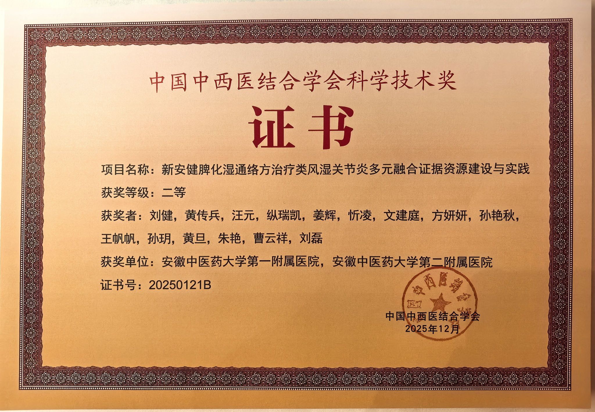12月19日,第一临床医学院国家中医药高水平重点学科中医痹病学学科带头人刘健教授主持申报的《新安健脾化湿通络方治疗类风湿关节炎多元融合证据资源建设与实践》项目,荣获中国中西医结合学会科学技术二等奖。