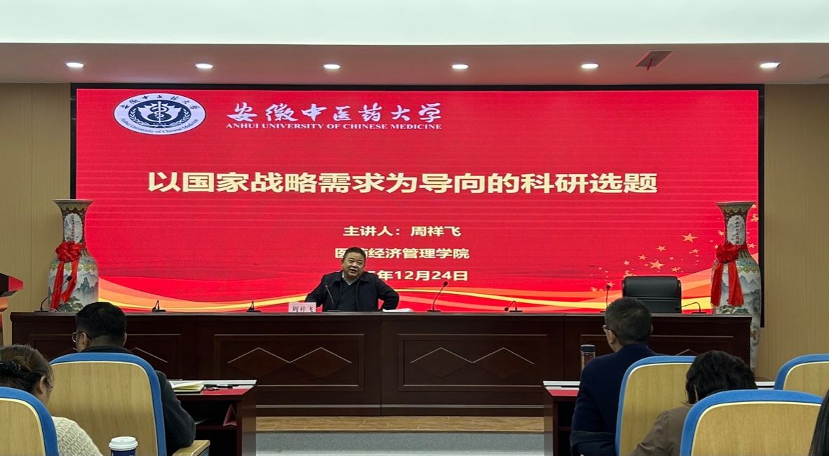 12月24日,医药经济管理学院特邀安徽省社科联党组成员、副主席周祥飞来院,开展题为《以国家战略需求为导向的科研选题》的专题讲座。活动由院长丰志培主持,学院党政领导班子、全体教职工及硕士研究生共同参加。