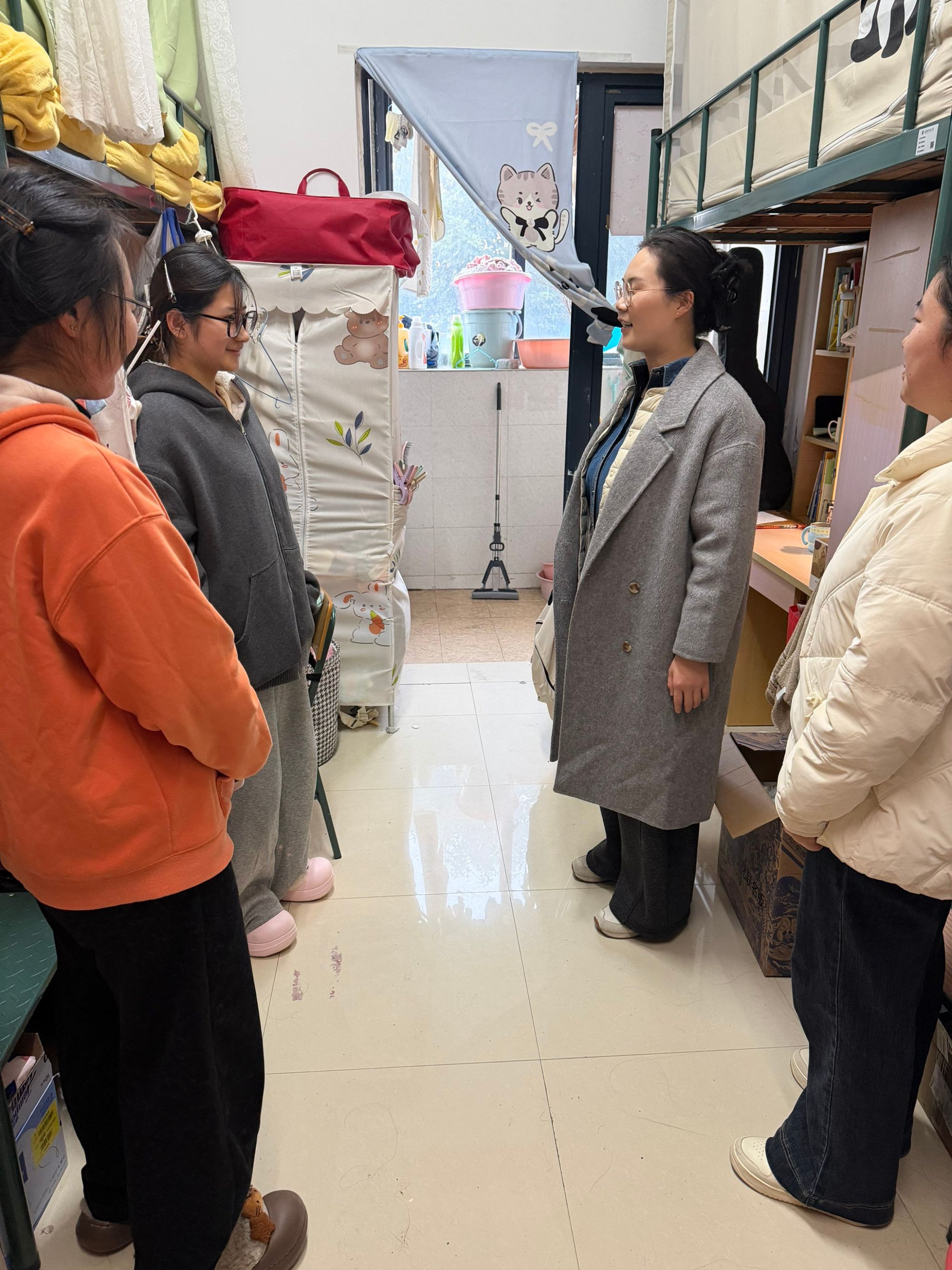 走访过程中,老师们重点排查了用电安全、消防隐患、物品堆放等情况,仔细检查有无私拉电线、违规电器使用等行为,并向学生普及冬季安全知识,强调遵守宿舍管理规定,确保人身与财产安全。“安全无小事,尤其在学期关键阶段,绝不能有丝毫松懈。”各辅导员在走访中叮嘱同学们,“学院将持续加强管理,为大家营造安全、舒适的生活学习环境。”