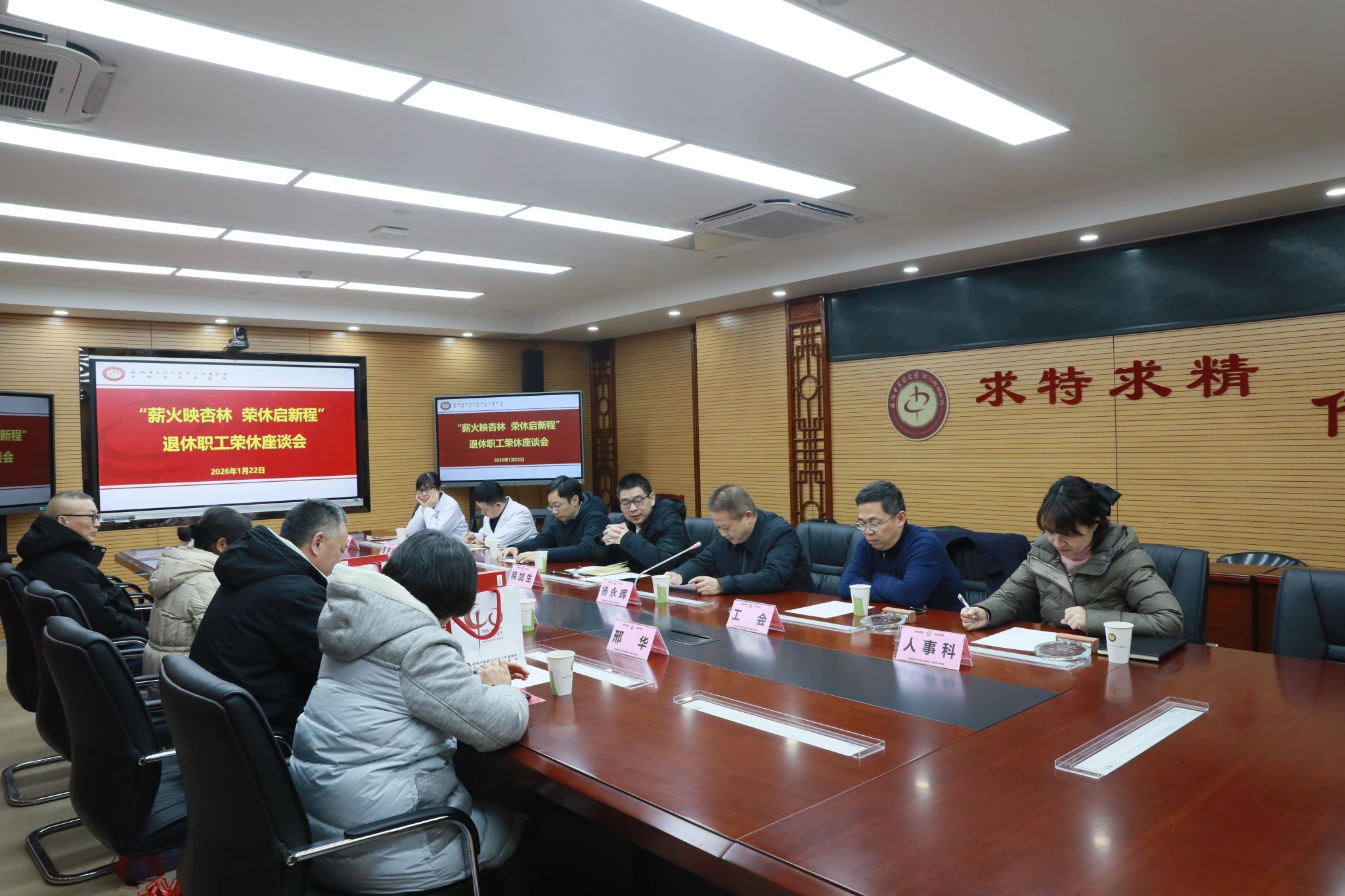 1月22日下午,校第二附属医院举行“薪火映杏林,荣休启新程”荣休座谈会。党委副书记韩加生、纪委书记秦瑜、相关职能科室负责人、部分新进职工代表及2024-2025年度退休职工参加会议。会议由副院长杨永晖主持。