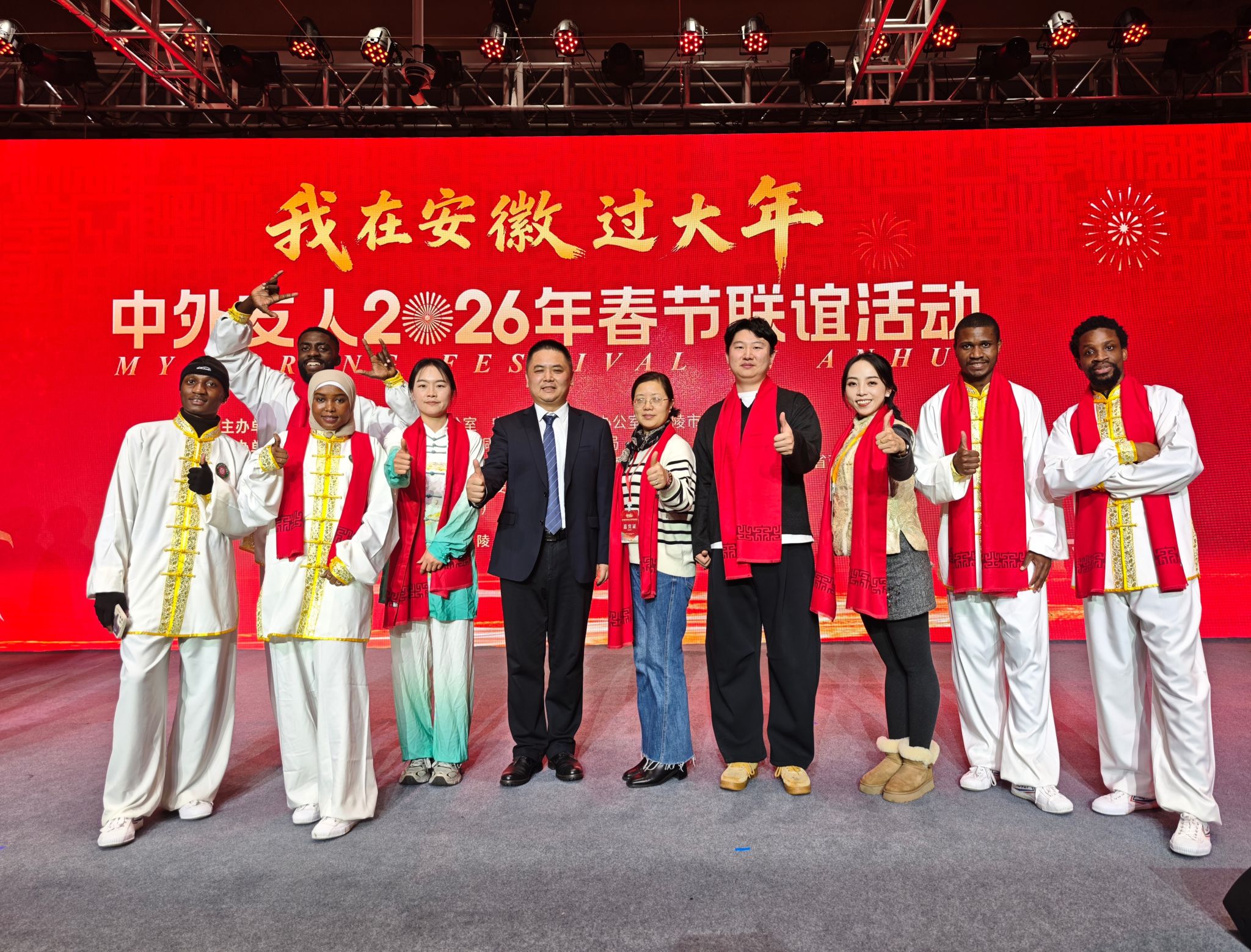 1月23日,由安徽省人民政府外事办公室(省港澳办)与铜陵市人民政府联合主办的“我在安徽过大年”中外友人2026年春节联谊活动在铜陵市义安区犁桥水镇圆满举行 。人文与国际教育交流学院党总支副书记顾义俊带队,体育健康学院李紫薇老师、国际学生辅导员魏子琦及5名国际学生参加了活动。