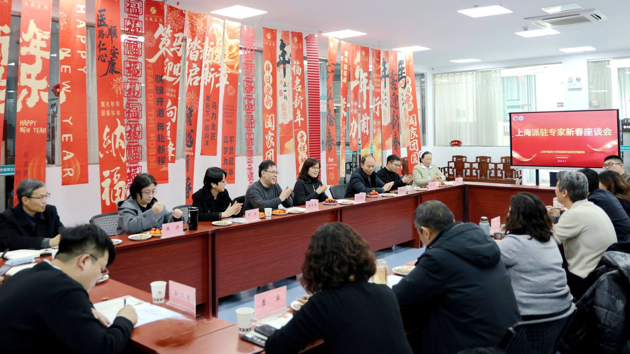 2月4日下午,曙光安徽医院召开2026年上海派驻专家新春座谈会,曙光安徽医院领导班子成员与上海派驻专家代表共叙情谊、共话发展、共绘蓝图,曙光安徽医院相关部门负责人列席。会议由曙光安徽医院党委书记张永先主持。