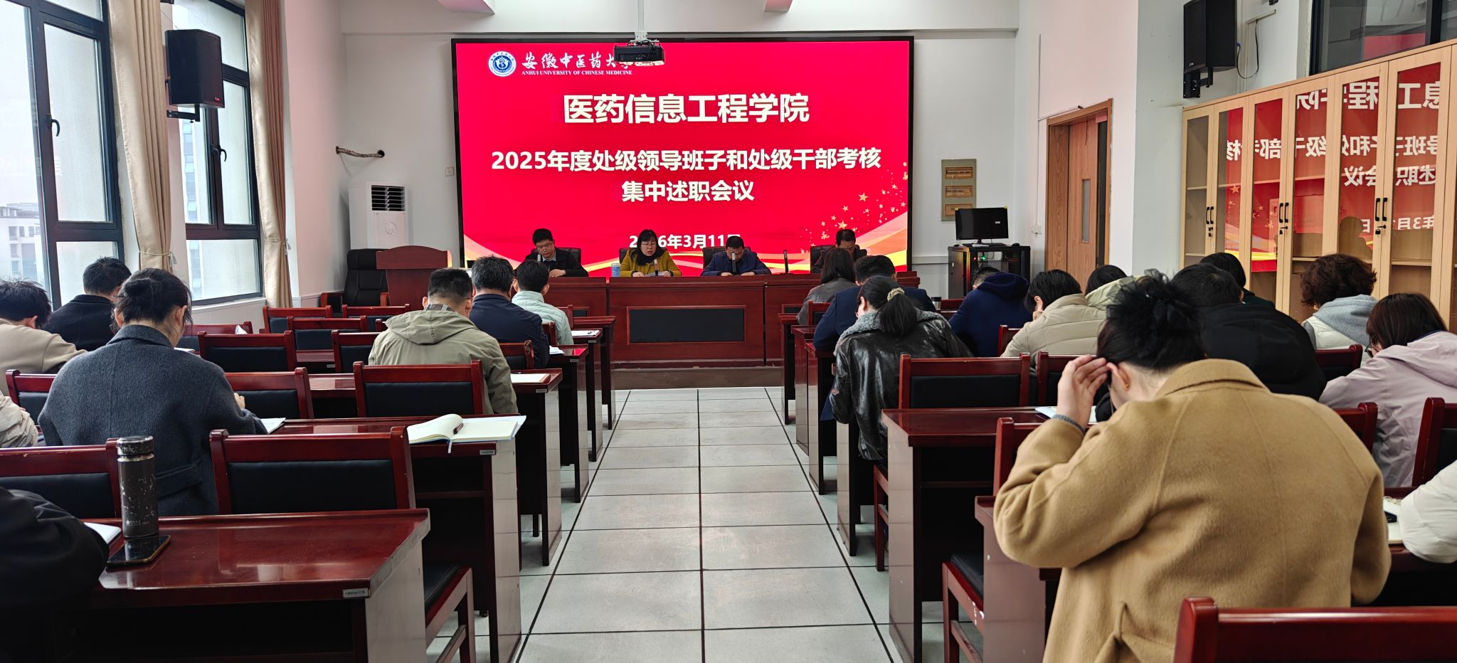 根据学校考核工作要求,3月11日下午,医药信息工程学院召开2025年度处级领导班子和处级干部考核集中述职会议,学院领导班子成员、全体教职工参会,会议由党委书记高霞主持。