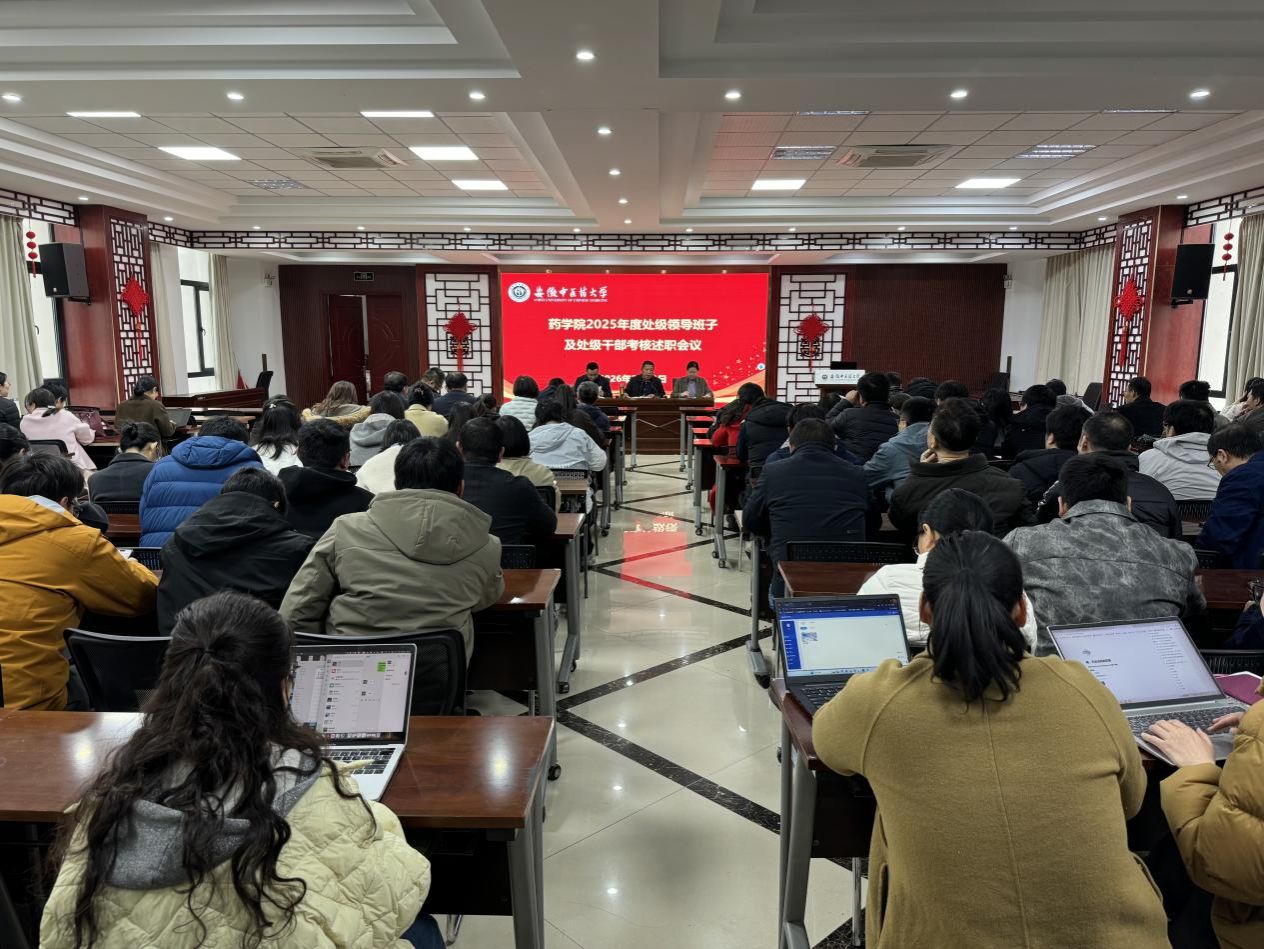本次药学院处级干部个人采取书面述职的形式,会前已向学院全体教职工公示了个人述职报告。会上,药学院党委委员、执行院长韩岚代表学院领导班子作2025年度工作述职,从党建、教学、学科建设、科学研究、对外合作交流及学生工作等方面汇报了学院2025年取得的工作成绩,强调2026年药学院将深入学习宣传贯彻党的二十大和党的二十届四中全会精神,全面加强党的建设,切实加强组织领导,按照学校的总体部署,紧扣“院办校”改革发展目标,持续深化内涵发展,着力提升人才培养质量、科技创新能力与社会服务水平,秉持“优势突出、特色鲜明、贡献卓越”的发展理念,为建设一流中医药大学而不懈奋斗。