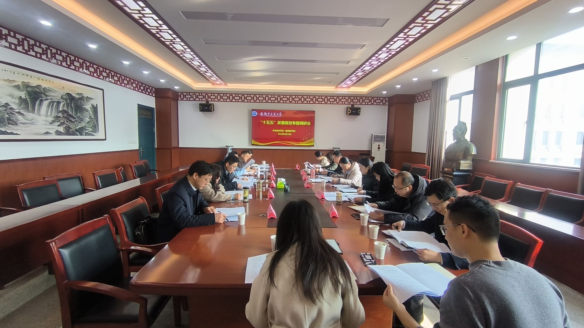 与会调研的部门充分肯定了学院“十五五”发展规划编制开展有序、定位精准、思路清晰、重点突出,契合国家中医药事业发展需求和学校一流中医药大学建设目标,具有较强的前瞻性和可行性。同时围绕学院发展定位、学科建设、人才培养、科研创新、国际交流合作等核心领域展开深入研讨并提出相关建议。要立足针灸推拿等学科特色,紧扣健康中国战略,聚焦中医药传承创新,打造具有全国影响力的针灸推拿学院特色学科品牌;要优化人才培养体系,强化实践教学环节,推动针灸推拿学专业与康复医学、人工智能、养老服务等领域深度融合,培养兼具专业素养和创新能力的复合型人才;要加强师资队伍建设,完善高层次人才引育机制,提升青年教师临床实践能力和科研水平,打造结构合理、业务精湛的师资梯队;要深化科技创新与成果转化,加强产学研协同创新,推动科研成果落地应用;要拓展国际交流合作,搭建国际化教学科研合作平台,提升学科国际影响力;同时,还对规划文本的指标量化、结构优化、举措细化等方面提出了具体修改意见。