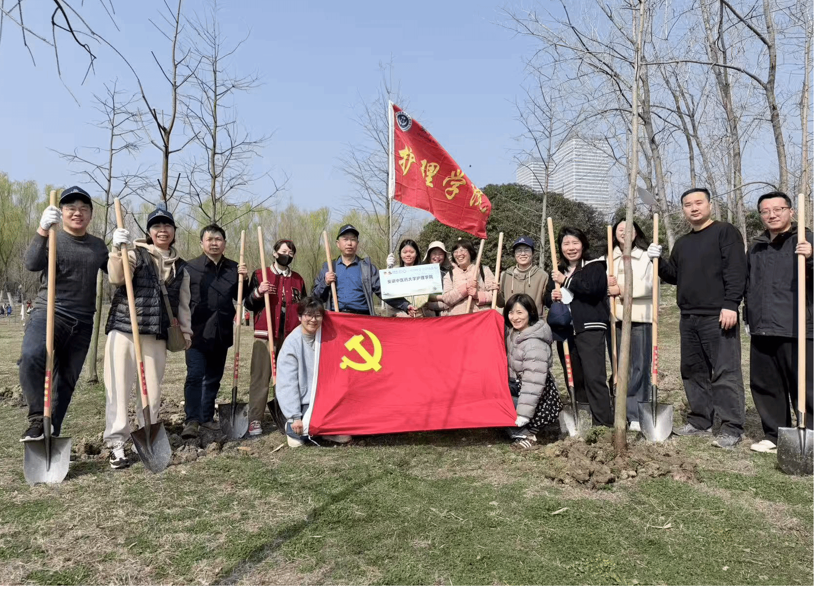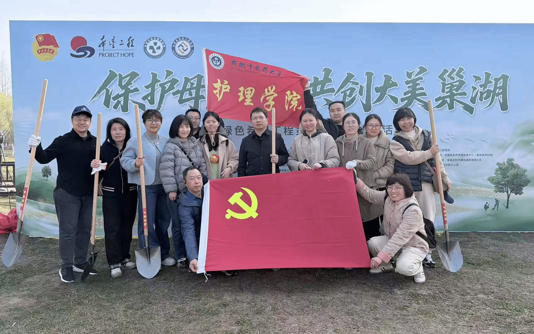 3月13日上午,由共青团安徽省委、安徽省青少年发展基金会及方兴社区联合主办的第六届“保护母亲河 共创大美巢湖”安徽绿色希望工程公益植树活动在塘西河畔热烈举行。护理学院党委积极响应号召,组织近20名教职工党员志愿者奔赴巢湖之滨,以实际行动践行“绿水青山就是金山银山”的生态文明理念,为共建美丽合肥增添一抹新绿。