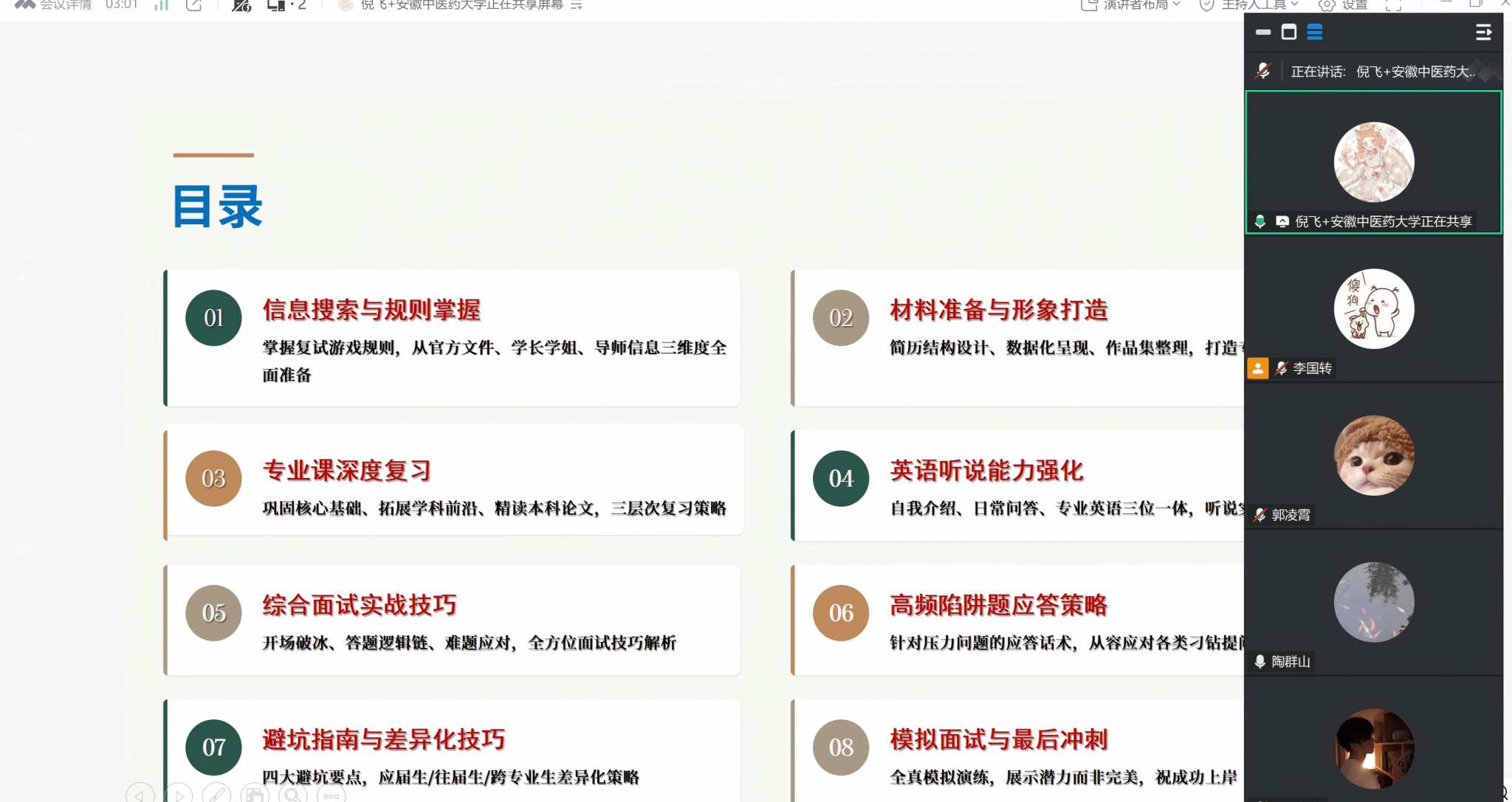 在朋辈经验分享环节,四位在读研究生结合自身“上岸”经历,围绕复试准备、面试技巧和调剂策略等方面进行了详实分享。他们从材料准备、简历撰写到专业课复习、英语能力提升,系统梳理了复试各环节的备考要点;在面试方面,分享了从进场礼仪、自我介绍到临场应变的实战经验;在调剂指导方面,结合具体案例,深入讲解了调剂信息的获取、院校筛选、系统填报等关键步骤,尤其强调了“黄金72小时”的调剂窗口期,并对调剂资格、时间节点、前期沟通等进行了全面梳理。来自一线的经验分享,为备考学子提供了清晰、实用的行动指南。