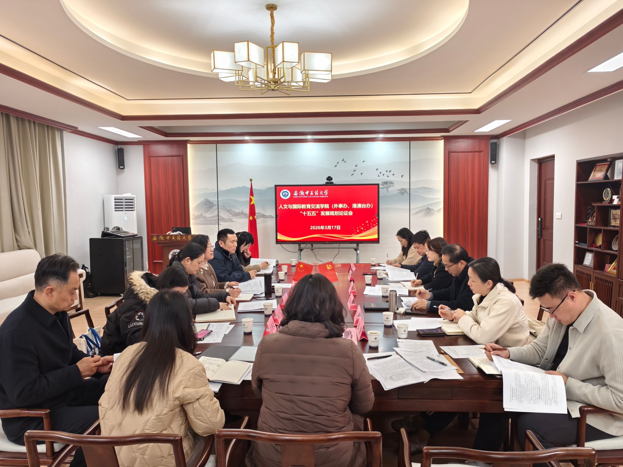 詹灵杰在总结讲话中指出,“十五五”时期是学校夯实发展基础、实现全面发力的关键阶段,科学编制并有效实施“十五五”规划,对于助力学校事业发展、服务国家战略需求具有重要意义。她充分肯定学院前期规划编制工作准备充分、目标明确、思路清晰,并就高质量完成规划编制工作提出三点要求:一要提高政治站位,把准发展方向。要始终坚持社会主义办学方向,将党的全面领导贯穿于学院发展的各领域全过程,推动规划编制与国家战略同频共振、与学校发展同向同行,紧密对接区域经济社会发展需求,深度融入学校整体发展布局。二要强化特色引领,明确发展重点。要坚持以人文学科为根基,以国际教育合作为支撑,着力培养具有实践能力和国际视野的复合型人才。要精准引才补齐短板,深化开放合作,持续提升办学影响力,聚力打造特色鲜明的“留学安中大”品牌。三要强化责任担当,确保落地见效。要全面摸清“十四五”时期发展家底,广泛开展对标调研,锚定全国中医药院校第一方阵的奋斗目标,增强规划编制的严谨性、逻辑性与可操作性,确保规划能用、管用、实用,真正成为引领学院未来五年发展的行动纲领。