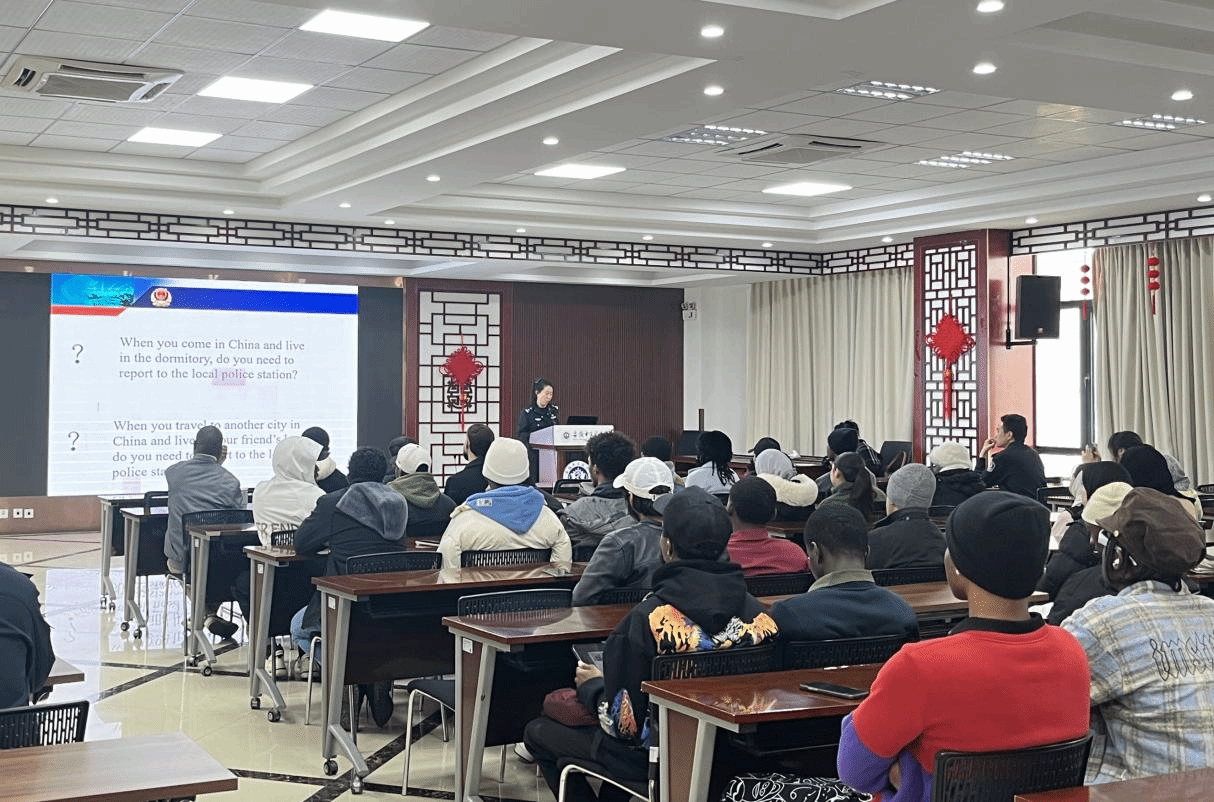 会上,合肥市出入境管理局宣莹莹警官以《中华人民共和国出境入境管理法》为核心,结合国际学生实际需求,系统讲解了签证办理、停留居留及兼职等相关政策,并就禁毒规定、宗教政策和防诈骗要点进行重点提示,引导学生增强守法意识,提高安全防范能力。交管新站大队综合中队宣传员陶静枝警官围绕《中华人民共和国道路交通安全法》开展宣讲,结合真实事故案例,重点讲解了未按规定佩戴头盔、闯红灯、逆行、未按规定车道行驶等行为的危害性,提醒师生自觉遵守交通规则,文明出行。