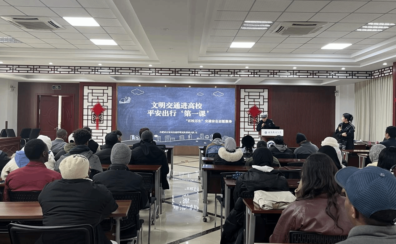 为加强国际学生法治教育,提升交通安全意识,3月19日上午,我院举办国际学生法治与交通安全专题宣讲会。新站公安分局治安大队大队长刘同雨,合肥市公安局出入境管理支队、交管新站大队综合中队、高教基地派出所相关负责同志,人文与国际教育交流学院党总支书记叶兰兰出席活动。我院全体国际学生,以及安徽职业技术大学、安徽艺术学院、合肥幼儿师范高等专科学校留管工作人员参会。