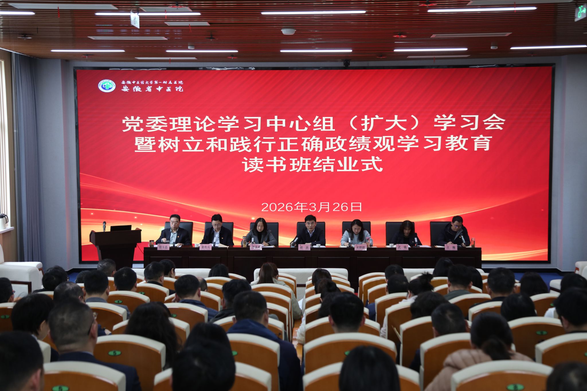 3月26日下午,第一临床医学院举办党委理论学习中心组(扩大)学习会暨树立和践行正确政绩观学习教育读书班结业式。医院领导胡波、宋婷婷、周其艳、武镝、黄传兵、汪瀚,党委委员殷玉磊,医院党委理论学习中心组成员、党总支书记、学习教育工作专班、职能部门负责人参加。