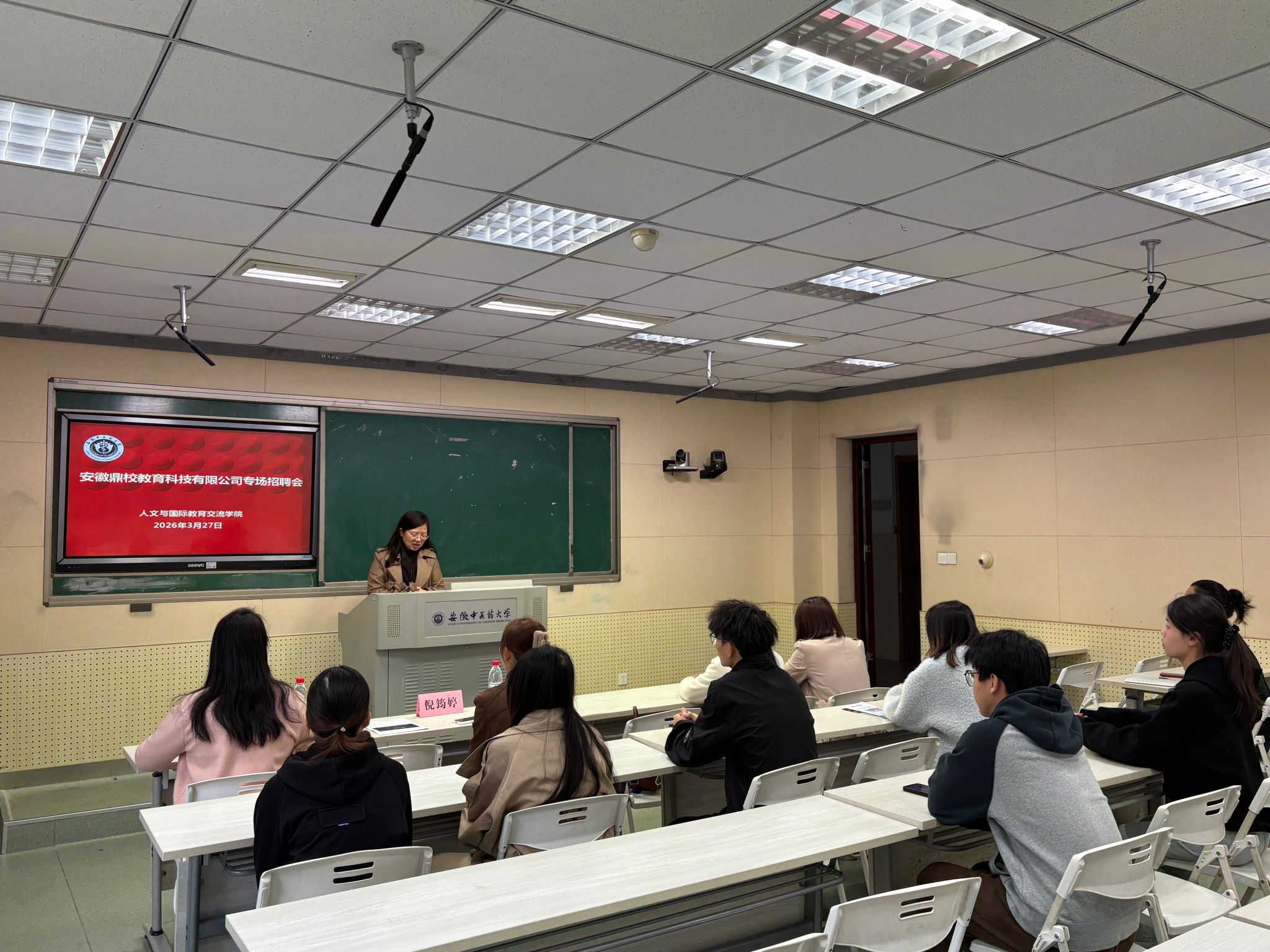 当日上午,安徽鼎校教育科技有限公司率先开展宣讲,详解企业文化、岗位需求及发展路径,现场学生积极互动,多名毕业生投递简历,部分低年级学生表达兼职意向。