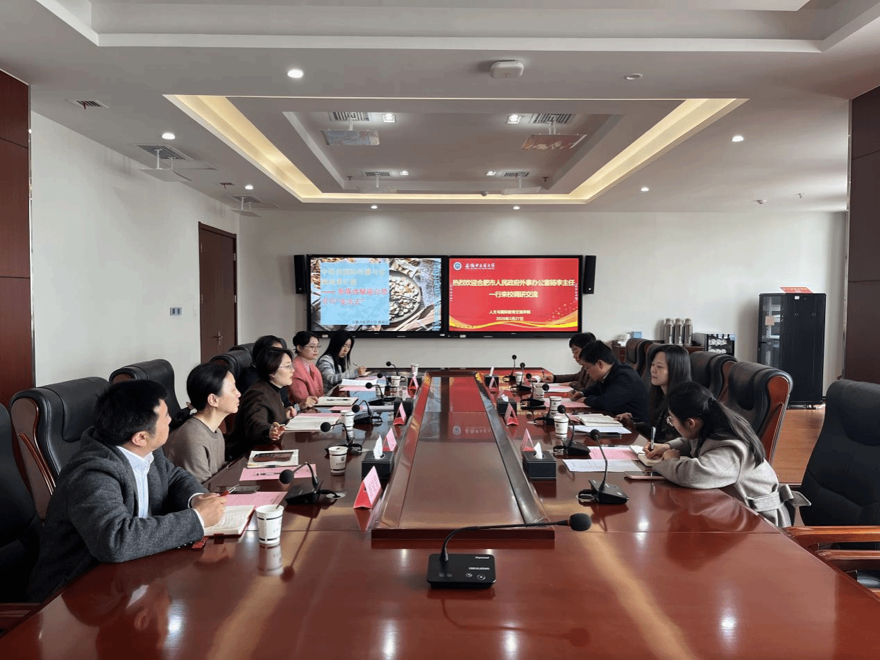 叶兰兰主持座谈会,周亚东对合肥市外事办长期以来对学校外事工作的关心支持表示感谢,并简要介绍了我校在中医药文化海外传播、留学生教育等方面取得的工作成效,希望以此次座谈为契机,进一步加强校地沟通对接、深化协同合作、凝聚工作合力。