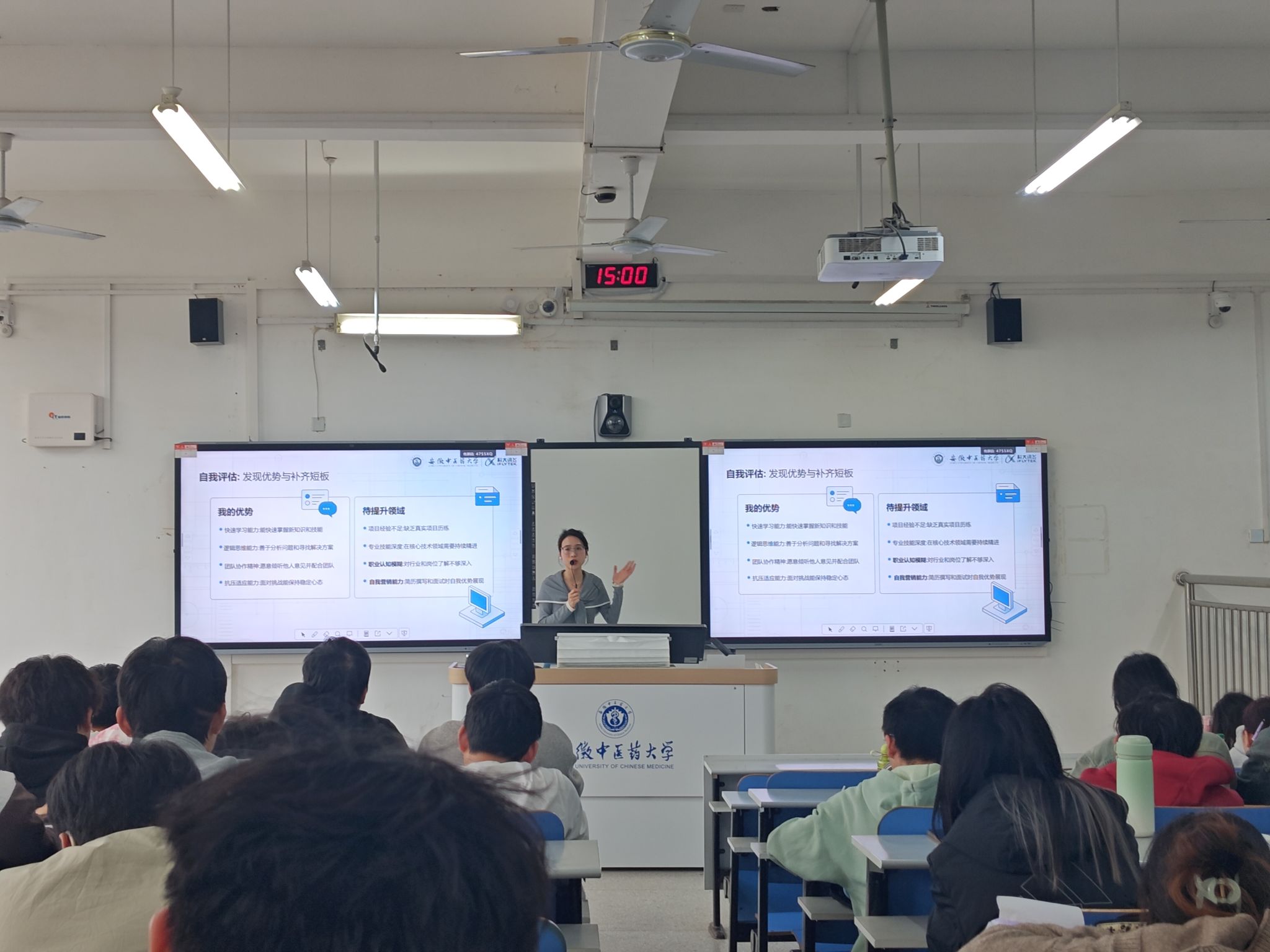 课程中,叶晨围绕个人发展现状分析、对标岗位要求自我评估、下一步行动规划三大核心模块展开系统讲解。结合产业人才需求与在校学生成长特点,带领同学们全面梳理学业基础、能力短板与发展潜力,指导大家对照行业岗位标准开展精准自我评估,重点检视专业技能、沟通协作、责任意识、学习能力等职场综合素养。
