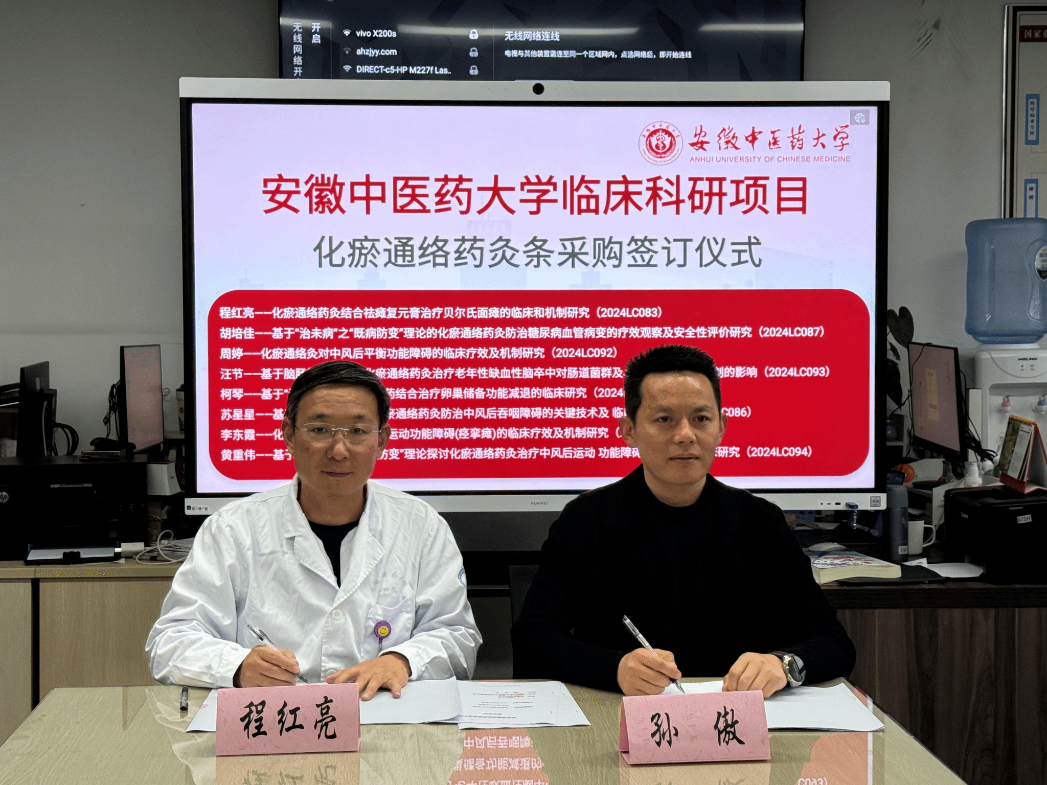 4月7日,安徽中医药大学临床科研项目“化瘀通络药灸条”采购签订仪式在第二附属医院顺利举行。此次签订旨在进一步深化产学研协同创新,推动中医药特色技术在临床科研中的转化应用,为中医药事业高质量发展注入新动能。第二附属医院副院长李梦,脑病五科科主任、主任医师程红亮,亳州市艾可舒医疗科技有限公司总经理孙傲及相关科研团队代表出席仪式。