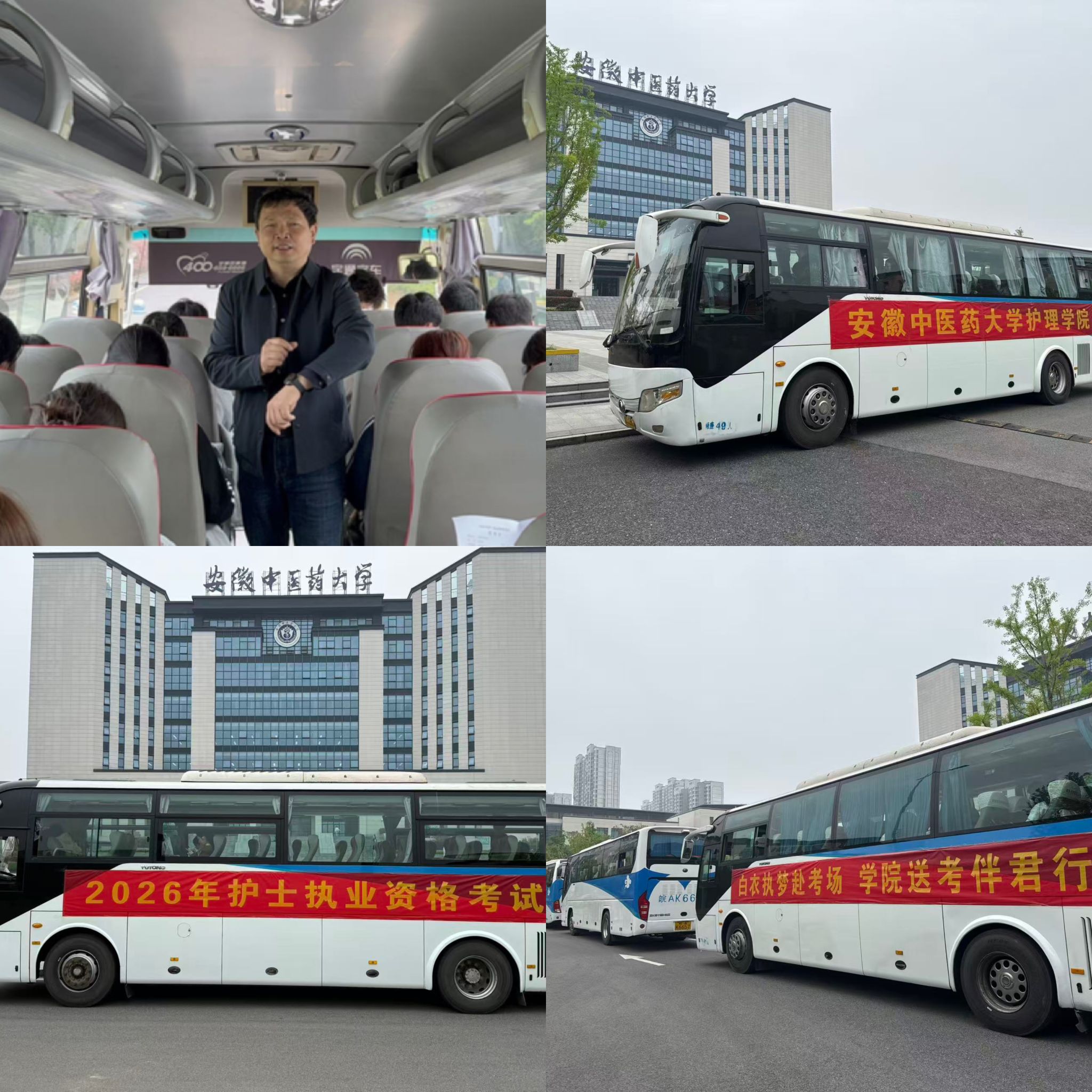 学院始终将护士执业资格考试工作,作为保障专业人才培养质量、落实立德树人根本任务、服务学生成长成才的关键实事来抓,高度重视、周密部署。为切实解决考生出行难、赶考慌等实际问题,学院提前谋划、统一调度,全方位优化护考服务方案:精心调配八辆属送考大巴,精准对接各考点节,全力确保每一位考生都能安全、准时、顺畅抵达考场,免去考生赶考后顾之忧。