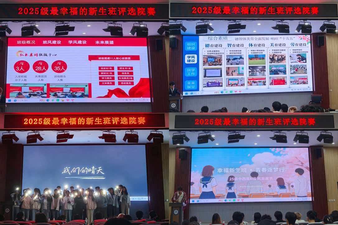 比赛现场氛围热烈而温馨,各参赛班级依次登台展示,通过班级风采视频、特色文化展示、集体节目演绎、成长故事分享等多元形式,生动展现班级在思想引领、学风建设、集体活动、互助成长等方面的丰硕成果。同学们精神饱满、自信昂扬,以真挚表达与默契配合,彰显出强大的班级凝聚力与向心力,深刻诠释了“幸福班级”的深刻内涵。评委们围绕班级文化建设、集体凝聚力、精神风貌、创新特色等多个维度进行综合打分,整场比赛秩序井然、精彩纷呈,充分展现了中西医结合学院学子昂扬向上、团结奋进的良好精神风貌。