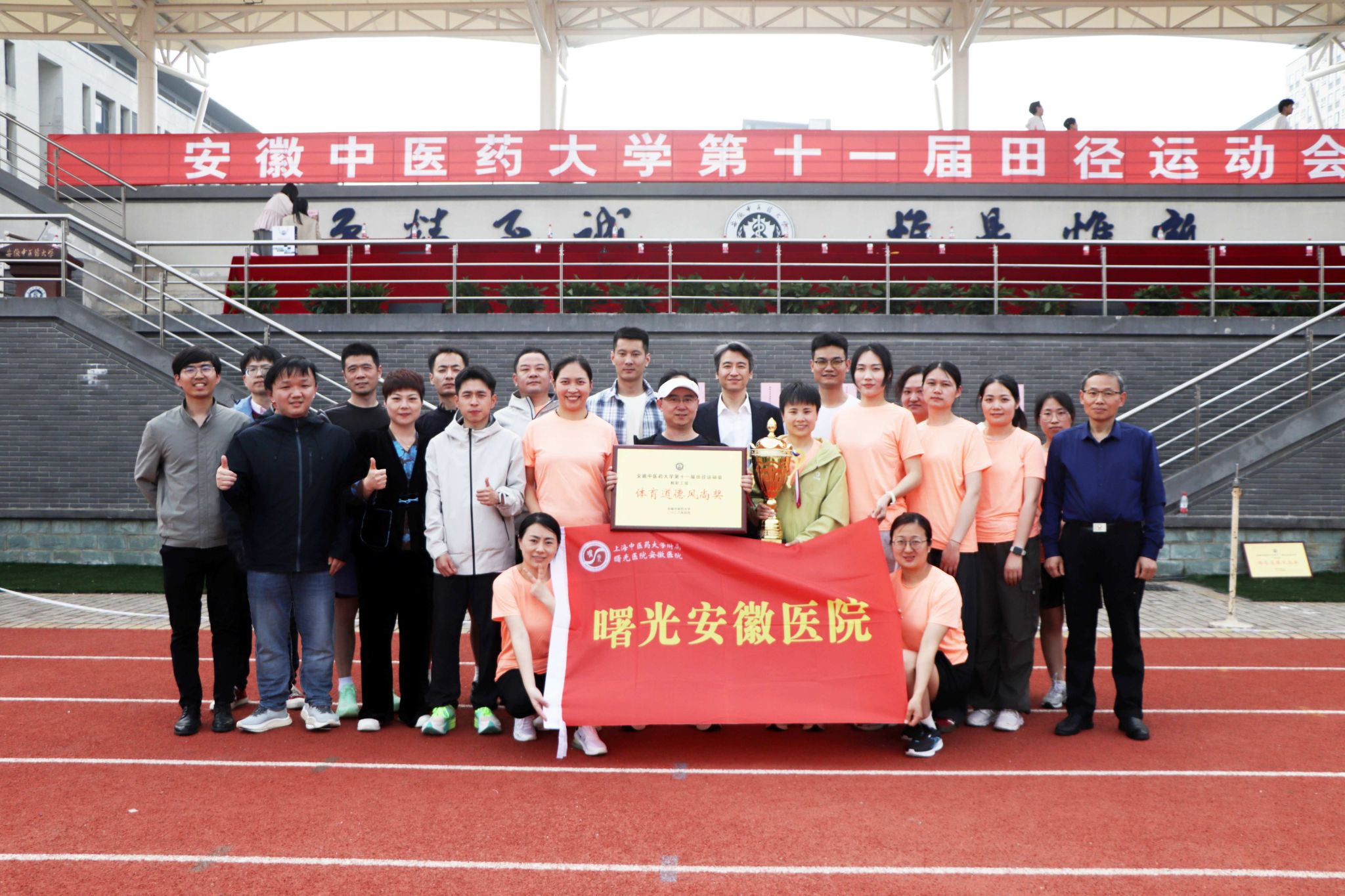 4月16日至17日,安徽中医药大学第十一届田径运动会在少荃湖校区体育场圆满落幕。曙光安徽医院党委书记张永先,党委副书记、执行院长李明,党委委员、副院长程耀堂,党委委员、纪委书记张晓峰,党委委员、总会计师陈黎华,党委副书记李卓,党委委员、办公室主任张军,党委组织员翟从永出席开、闭幕式。由全院50余名职工组成的参赛队伍奋勇争先、团结协作,不仅成功打破教工组女子400米及女子跳高两项校运会纪录,更以5金5银3铜的亮眼战绩荣获教工组团体总分第三名及“体育道德风尚奖”,充分展现了曙光安徽医院职工昂扬向上的精神风貌与强劲的综合实力。