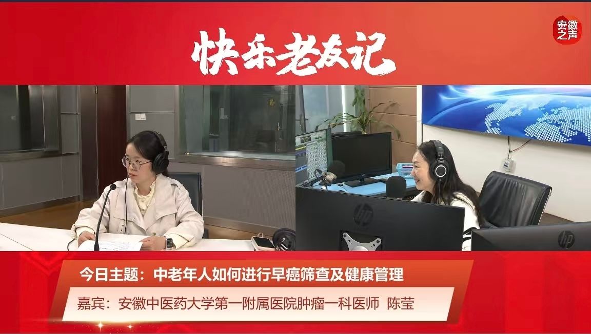 肿瘤科陈莹医师在安徽之声《快乐老友记》栏目进行科普直播,为中老年人群讲解早癌筛查与健康管理知识,提出“管住嘴迈开腿的预防理念,定期查、早发现的筛查方案,信科学不盲从的正确心态”的健康准则,帮助中老年群体树立科学防癌、健康管理理念。