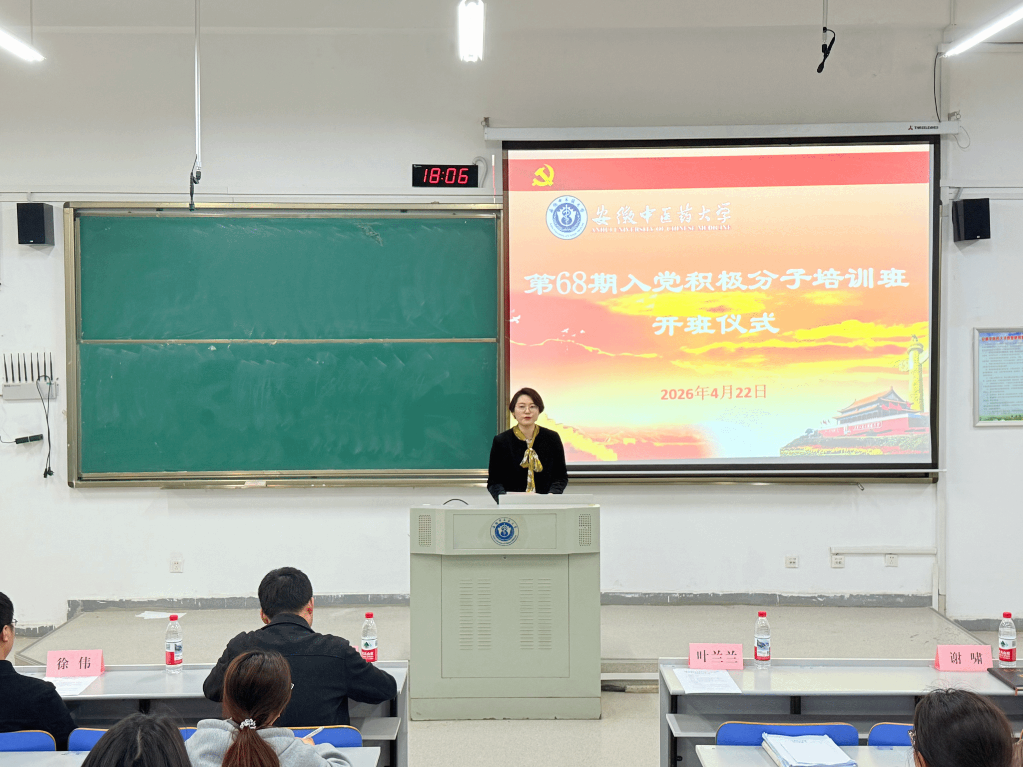 4月22日,安徽中医药大学少荃湖校区第三片区分党校第68期入党积极分子暨“青马工程”培训班开班式顺利举行。人文与国际教育交流学院党总支书记叶兰兰,医药信息工程学院党委副书记、纪委书记王向阳,医药信息工程学院组织员徐伟,医药经济管理学院组织员周慧恩出席开班式。来自医药经济管理学院、医药信息工程学院、人文与国际教育交流学院的全体第68期入党积极分子参加开班式。开班式由医药经济管理学院党委副书记、纪委书记谢啸主持。