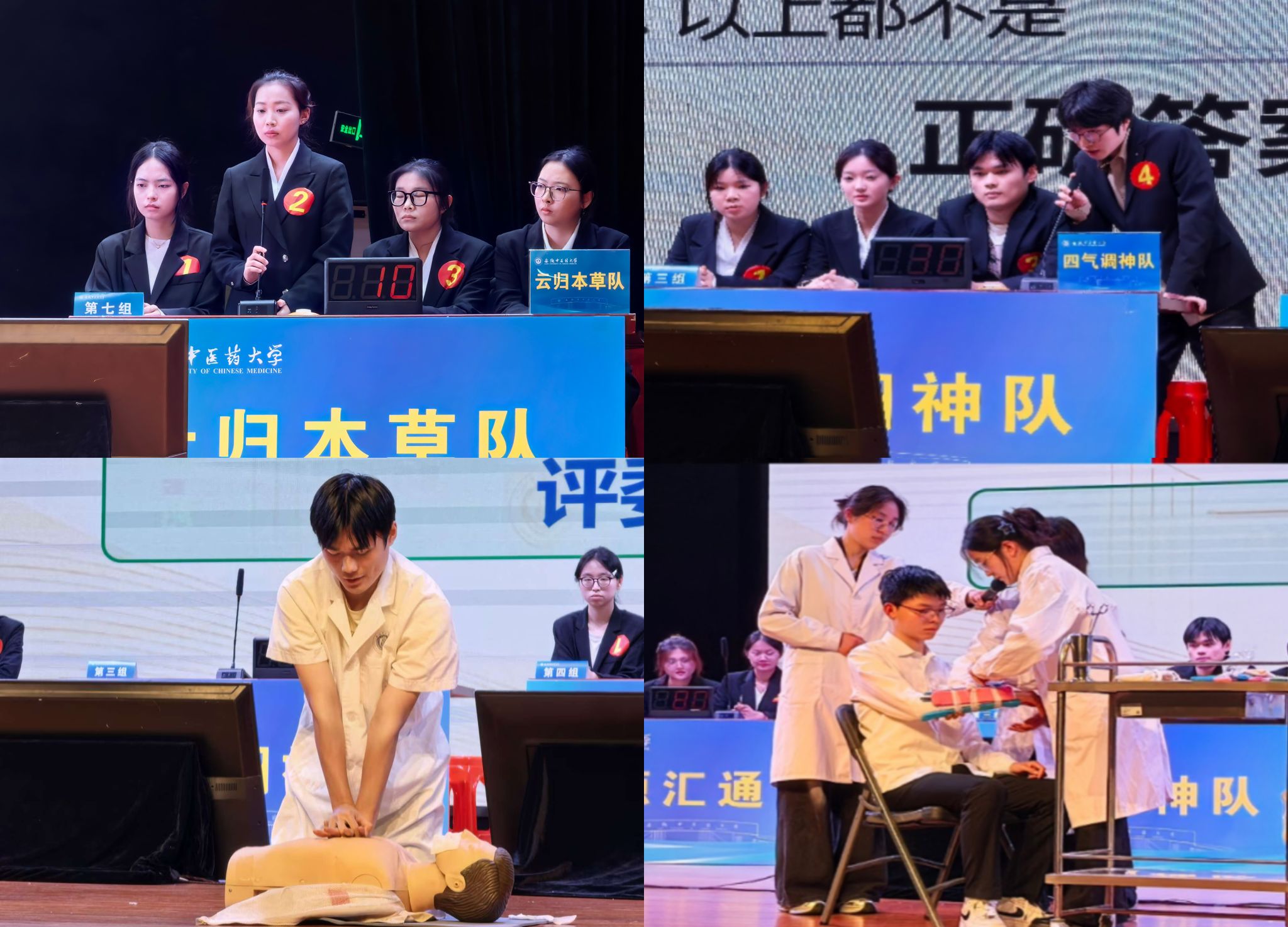 本次大赛共有22个班级的1396名中西医临床医学专业同学报名参加,其中28名选手经过初赛、复赛两轮激烈笔试脱颖而出,组成7支代表队参加了决赛。竞赛现场气氛紧张而有序,选手们全神贯注、从容作答,规范流畅的操作与昂扬自信的风貌,引来评委频频赞许、观众掌声不断。观赛区同样活跃,同学们遵守纪律、积极响应,在互动环节中思维敏捷、应答准确,展现出浓厚的学习热情。大赛设置必答题、方歌背诵与中药辨认题、抢答题、病例分析与技能操作题、风险题五个竞赛环节,历时两个多小时,最终决出一等奖1名、二等奖2名、三等奖4名。