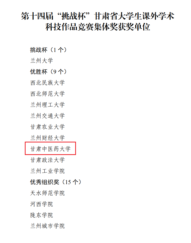 甘肃中医药大学学生作品在第十四届“挑战杯”甘肃省大学生课外学术科技作品竞赛中勇创好成绩